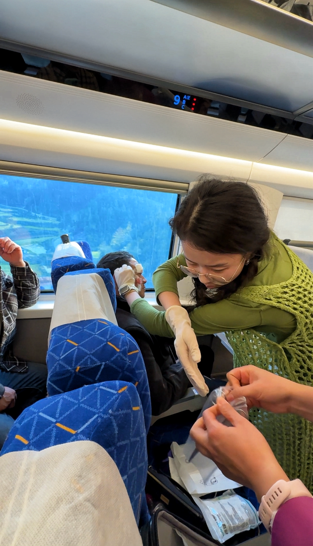 借助列车工作人员提供的简易医疗用品