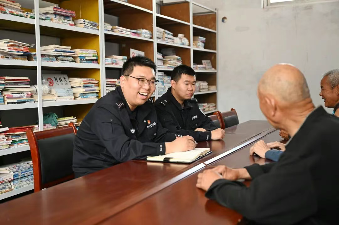 4月9日,王健和同事来到海拔近700米的石门村巡逻,同时向村民们进行普法及安全宣传。村里的很多年轻人都出去打工了,留守的大多是老人,“我们常来这里巡逻,给老人们念叨念叨预防火灾和防范电信网络诈骗的事儿,另外摸排一下村民的‘急难愁盼’。”王健说。