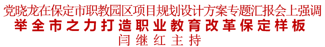 党晓龙强调,要以走在前列的使命感,担当作为推进职教园区建设。进一步统一思想、凝聚共识,拧紧责任链条,强化担当作为,举全市之力打造职业教育改革的“保定样板”。要以解放思想的紧迫感,破解难题推进职教园区建设。科学划定规划范围,统筹考虑职教园区与主城区、清苑区、保定南站的关系,推动现代职业教育发展与城市经济产业区和城市生活区融合发展。要围绕职教园区发展愿景,与“7+18+N”现代产业体系深度契合,做好校企合作、产教融合文章。要坚持绿色、创新、数字、共享、融合的园区定位,突出教学、实训、资源共享、双创孵化、生活服务功能,实现文体教学设施、生活服务设施资源共享,打造寓美学于实用的建筑风貌。要以真抓实干的责任感,凝聚合力推进职教园区建设。以真抓促落实,以实干求实效,倒排工期抓进度,确保项目建设顺利推进。