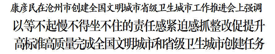 会议指出,创建全国文明城市和省级卫生城市是一项事关全局、利在长远的大事,对于全面提升沧州形象和文明程度、推动经济社会高质量发展、加快建设沿海经济强市具有重要意义。今年以来,各级各部门结合城市更新和城市环境容貌提档升级,围绕整治交通秩序和城乡环境、浓厚创建氛围等做了大量工作,取得一定成效,但从全市推进情况来看,任务重、短板多、时间紧,形势依然严峻。各级各部门要强化认识、正视差距,以等不起、慢不得、坐不住的责任感紧迫感做好各项工作,完成创建任务。