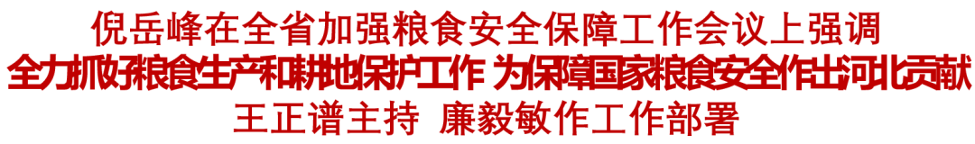 6月9日上午,全省加强粮食安全保障工作会议在石家庄召开。省委书记倪岳峰在会议上强调,要深入学习贯彻习近平总书记重要批示指示精神和党中央、国务院部署要求,提高思想认识,采取有力举措,全面排查整改突出问题,全力抓好粮食生产和耕地保护工作,为保障国家粮食安全作出河北贡献。省委副书记、省长王正谱主持会议,省委副书记、秘书长廉毅敏作工作部署。