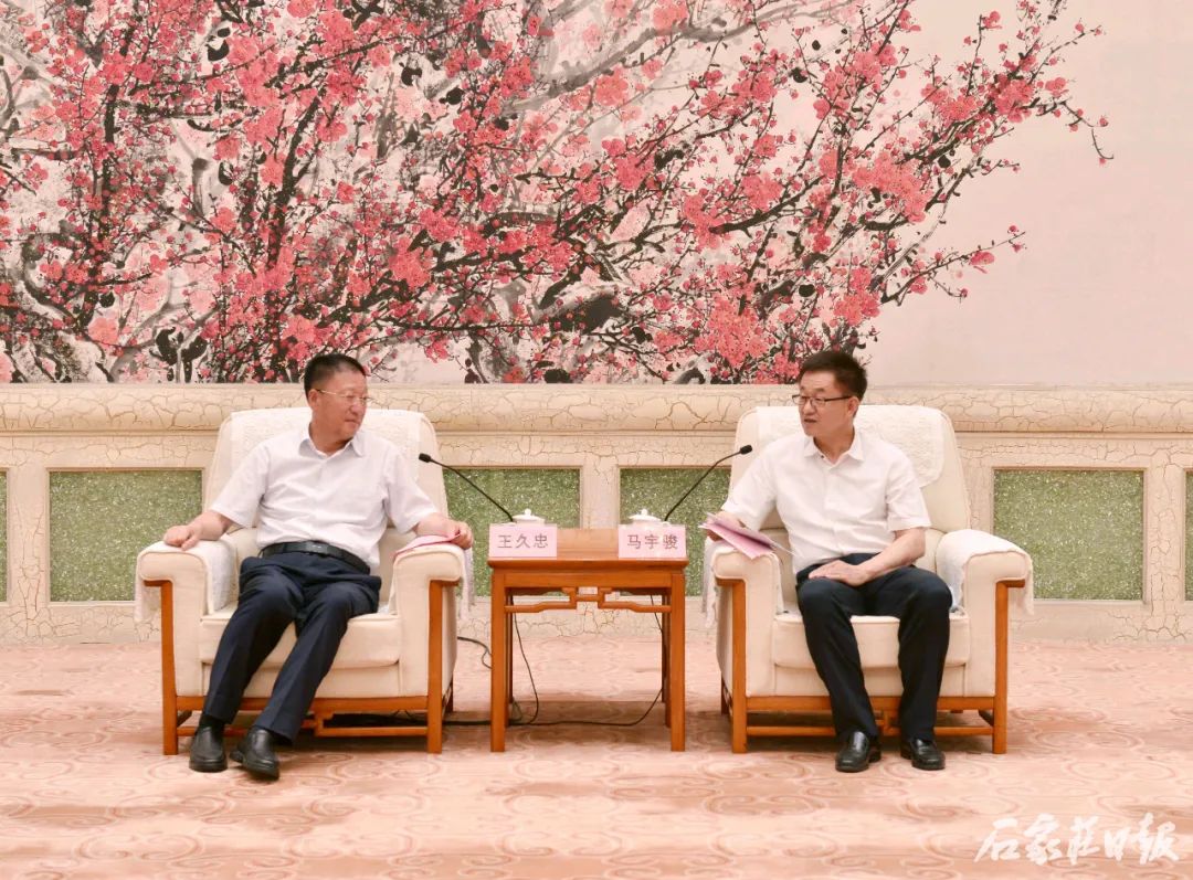 马宇骏对王久忠一行的到来表示热烈欢迎,并简要介绍了石家庄的经济社会发展情况。他说,随着京津冀协同发展的深入推进,雄安新区的加速崛起,河北省委、省政府《关于大力支持省会建设和高质量发展的意见》的全面落实,为石家庄发展带来了前所未有的重大机遇,石家庄正在发生着日新月异的变化,综合经济实力不断增强、城市载体功能持续完善、空气质量稳步提升、社会各项事业蓬勃发展。去年市第十一次党代会,提出了“经济总量过万亿,质量效益大跃升”等“七个大跃升”的奋斗目标,全市上下正以“实干兴石、舍我其谁”的担当精神,不断掀起“石家庄在行动”的新高潮。今年1-5月份,全市经济运行持续向好,主要经济指标继续保持两位数增长,形成了加快发展、跨越赶超的强劲势头,在城市建设、招商引资、科技创新、产业培育、优化环境等方面闯出了新路子,取得了远超预期的成效,各级干部群众从中看到了希望,增强了信心。巴州历史悠久,人文荟萃,是古“丝绸之路”的重要通衢,是新疆重要的综合交通枢纽。近年来,巴州紧紧围绕新时代党的治疆方略,牢牢抓住社会稳定和长治久安总目标,推动各项工作往前赶、朝前促,实现了“十四五”发展良好开局,经济增长创近年来最好水平,各族群众获得感幸福感明显增强。