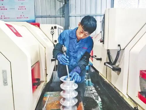 在霸州市宏伟机械有限公司生产车间内,工作人员正在检测铝制电力滑轮质量。河北日报通讯员 李海川摄