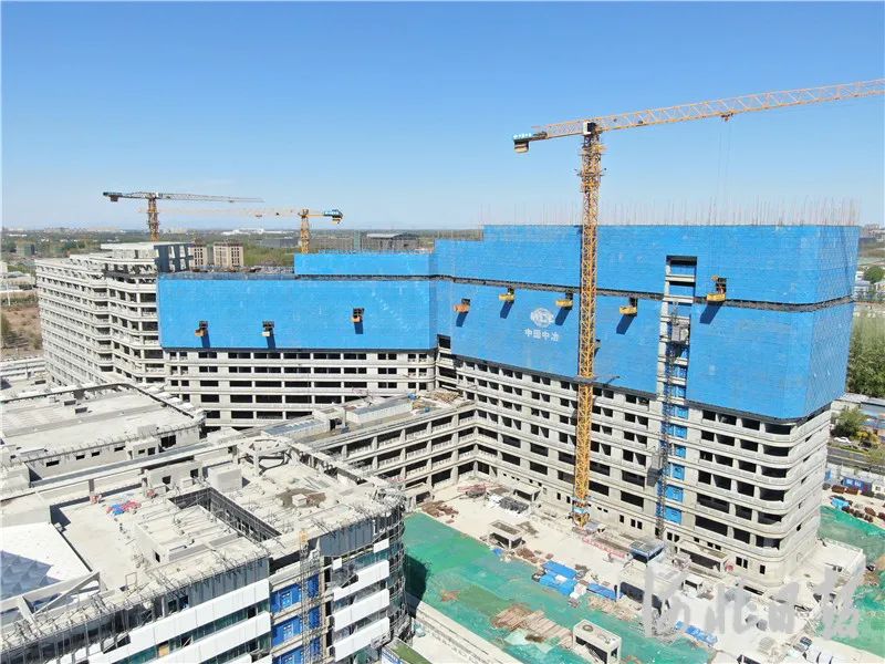 中冶天工集团承建的河北中国医学科学院肿瘤医院项目3号综合住院楼主体结构封顶,项目建设取得阶段性进展。图为建设现场。