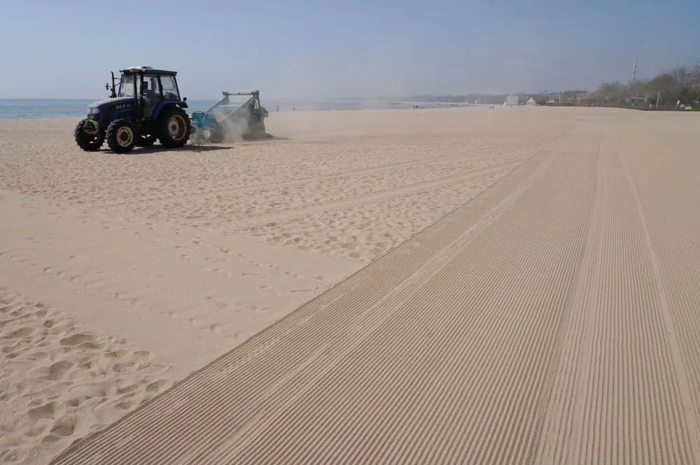 ↑4月23日,工人在秦皇岛市北戴河区浅水湾浴场使用机械设备过滤海滩上的沙子。新华社记者 杨世尧 摄