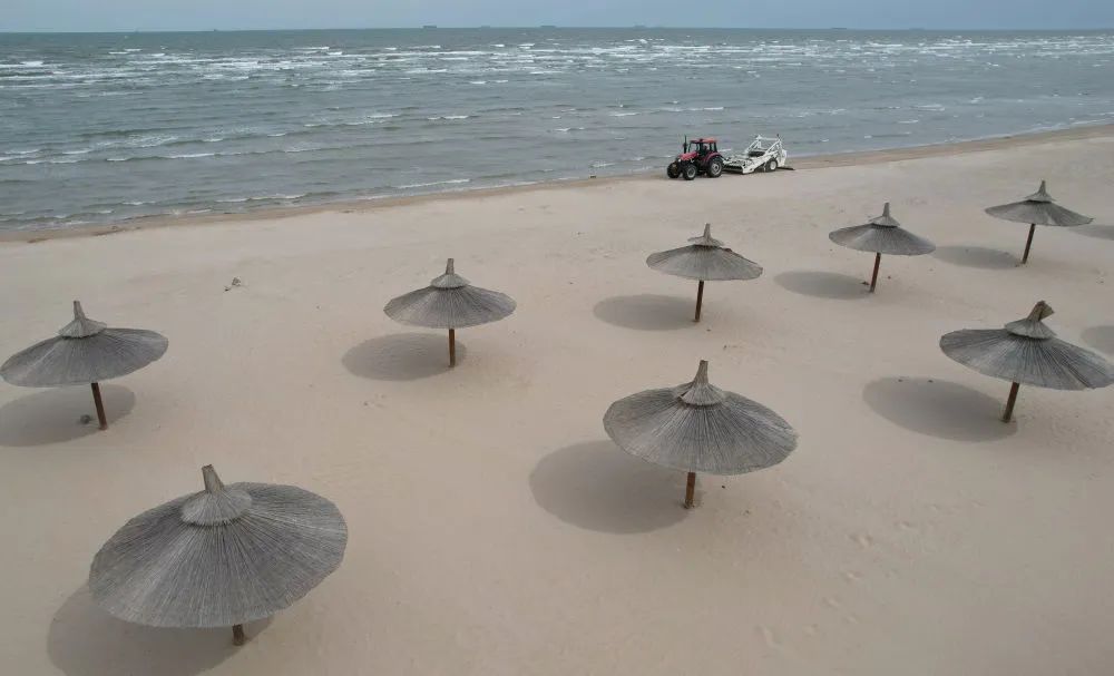 ↑4月23日,工人在秦皇岛市北戴河区浅水湾浴场使用机械设备过滤海滩上的沙子(无人机照片)。新华社记者 杨世尧 摄
