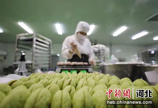 图为在固安县兴芦农业科技集团冷链食品生产车间,工人们正在加工甜点。肖靖凯 摄