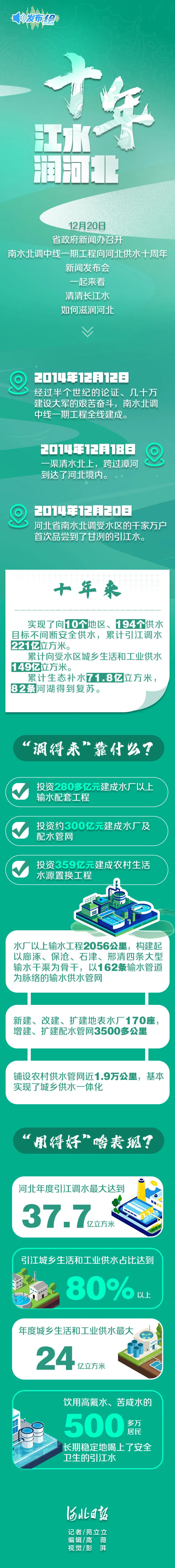 从12月20日省政府新闻办召开的南水北调中线一期工程向河北供水十周年新闻发布会上获悉,十年来,我省累计引江调水221亿立方米,其中年度引江调水最大达37.7亿立方米,超全省65座大中型水库的多年平均蓄水量。奔流不息的南水,极大改善了我省水资源严重短缺的状况,有力支撑了全省经济社会发展,显著提升了河湖水生态环境。