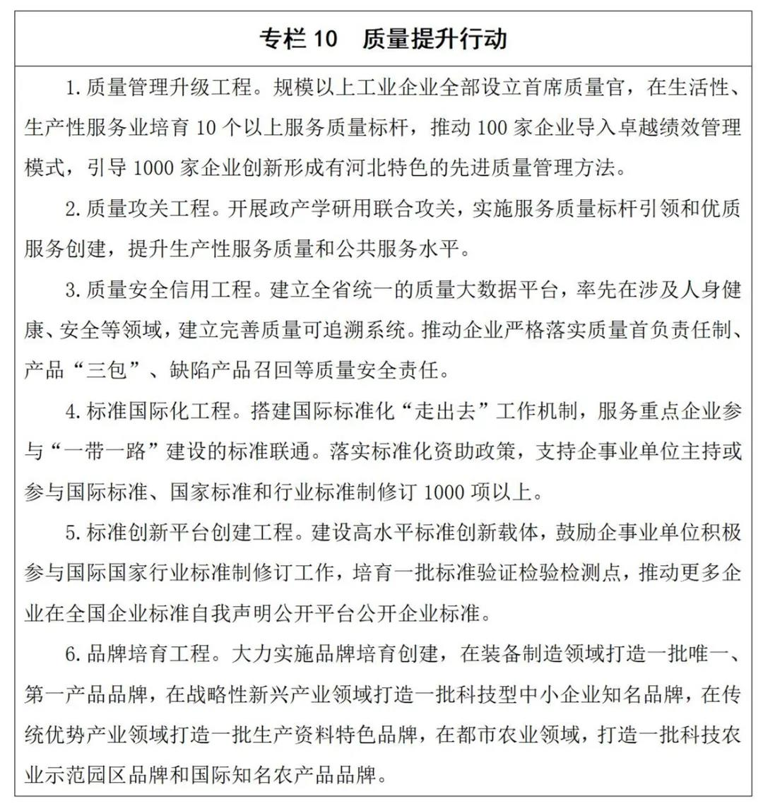 质效水平显著改善。产品和服务的标准、质量、品牌、信誉联动提升,有效供给不断扩大,供给质量和产出效益显著提高,制造业质量竞争力指数达到中高等水平,河北品牌影响力明显提升,全员劳动生产率年均增长6%以上。
