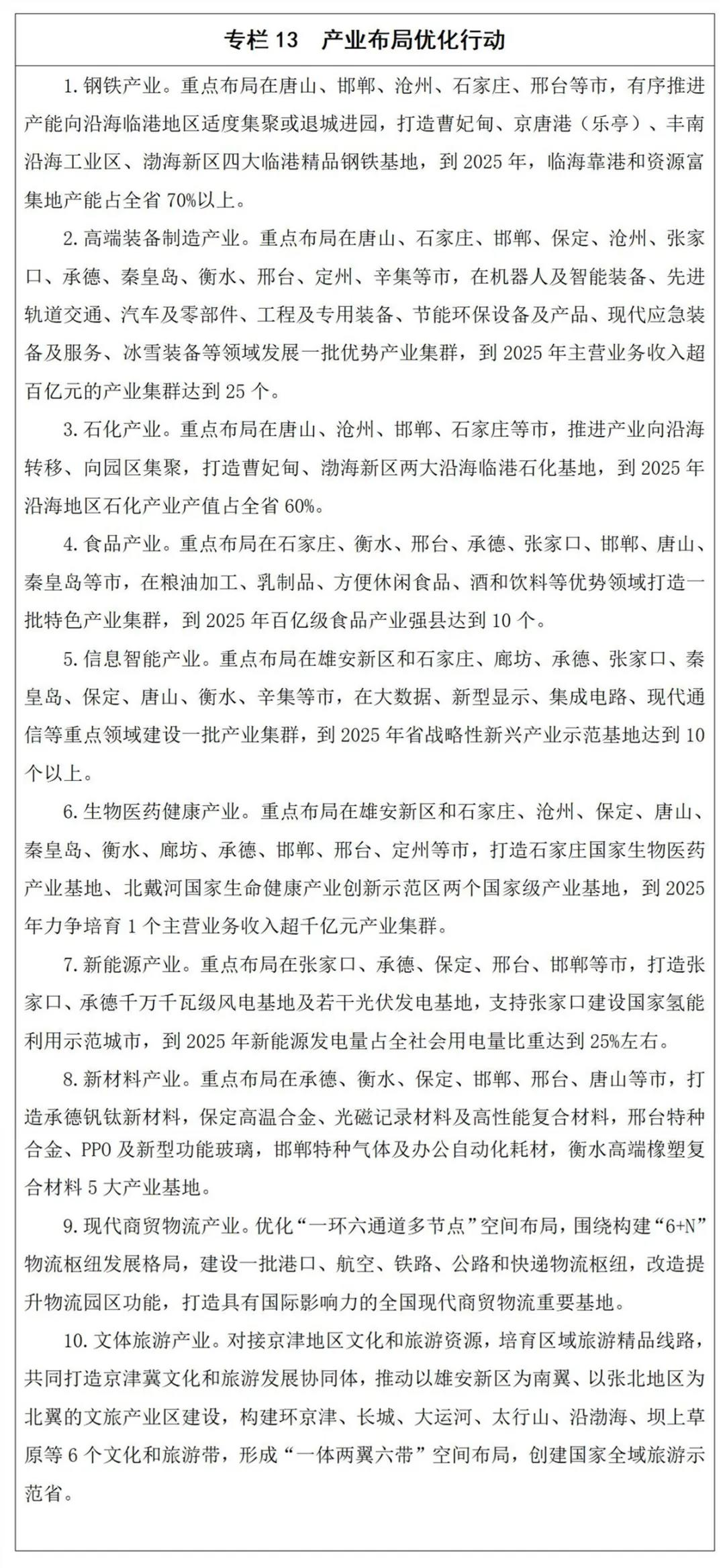 四区。曹妃甸区、渤海新区、北戴河新区、北京大兴国际机场临空经济区,瞄准自身功能定位,加快引进承接一批高端优势项目,打造环渤海地区新型工业化基地、国家生命健康产业创新示范区、国际开放门户和航空大都市,促进海洋经济、生物经济、临空经济跨越式发展,打造带动全省产业高质量发展的重要增长极。