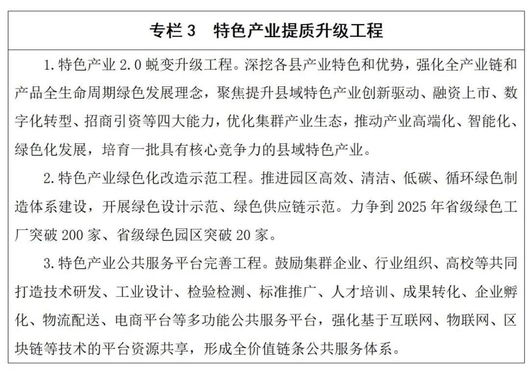 (三)提质升级县域特色产业。突出6大领域、107个重点特色产业集群,以专业化、标准化、精品化为主攻方向,紧紧围绕工业设计、创新能力、产品品质、品牌服务,加快特色向特长转变、集聚向集约转变、规模优势向能力优势转变,着力提升发展质效和市场竞争力。