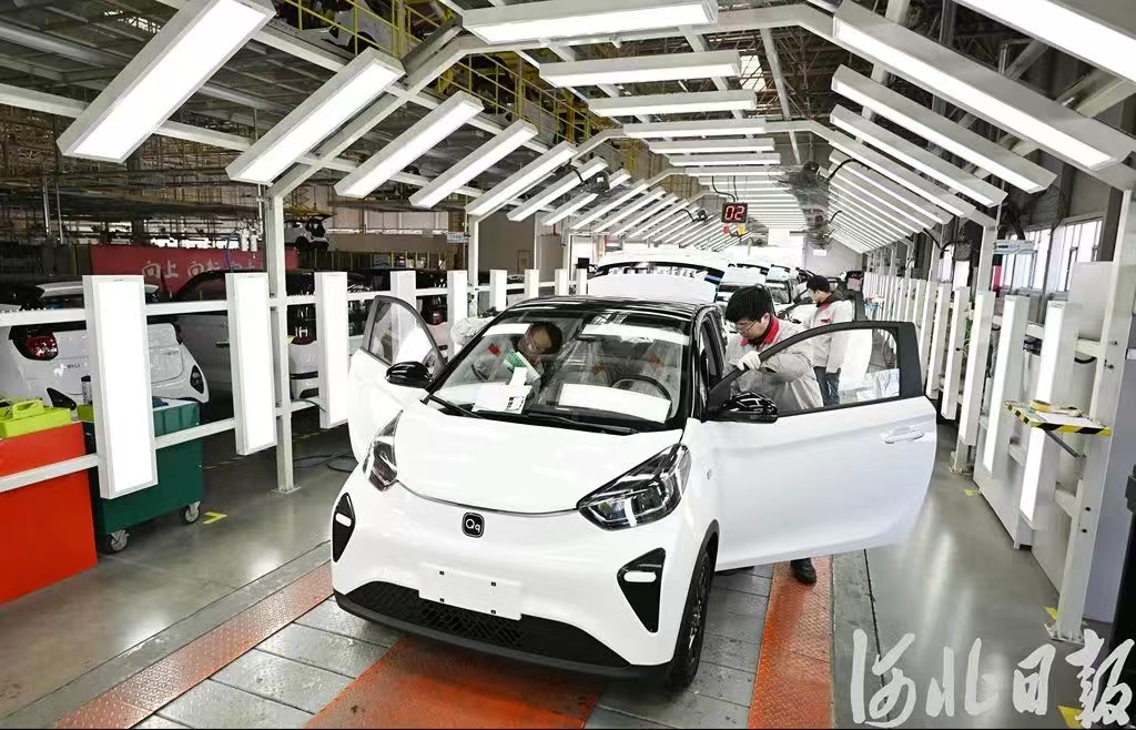 2月25日,奇瑞新能源汽车股份有限公司石家庄分公司总装车间员工在对新能源汽车进行调试。河北日报记者史晟全摄