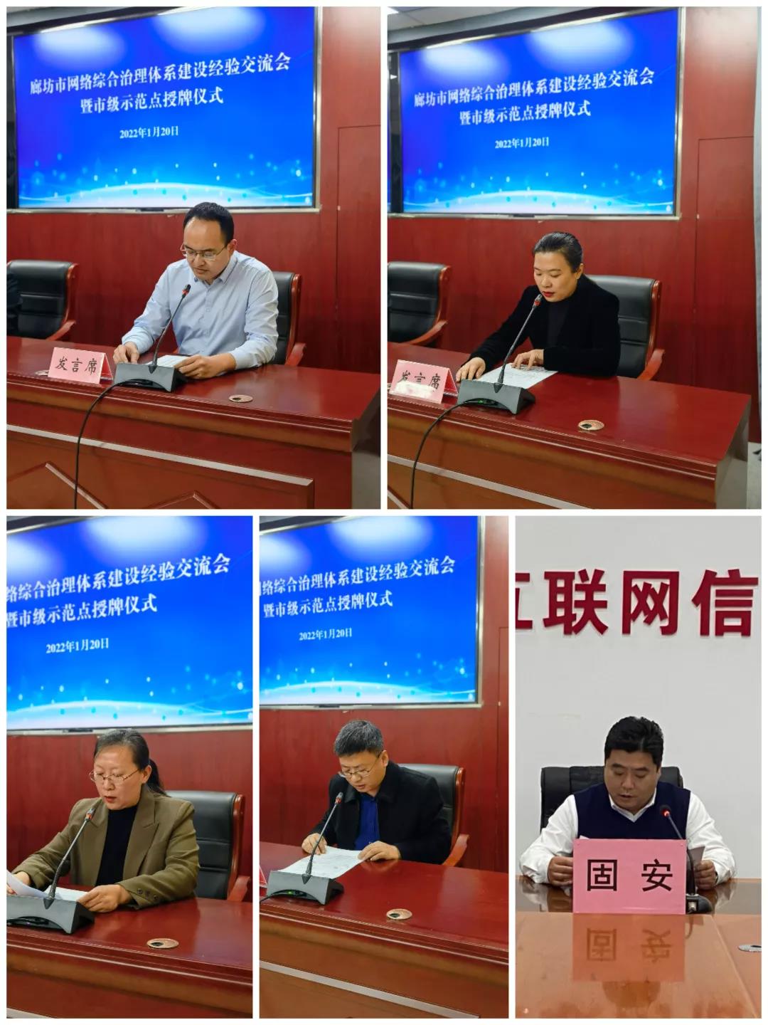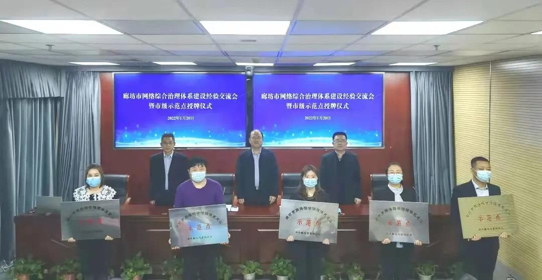 会上,市委网信办为网络综合治理体系建设市级示范点授牌。省级示范点代表润泽科技有限公司、广阳区馨境界社区负责人和广阳区、安次区、固安县网信办负责同志作了交流发言。