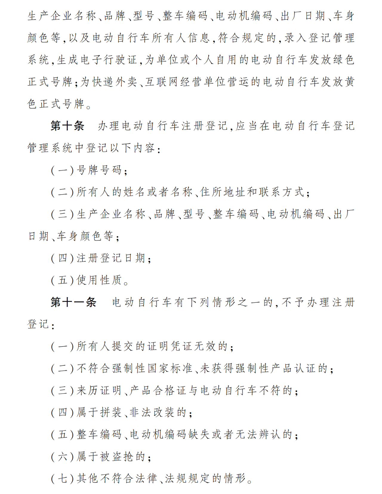 公安机关交通管理部门对符合强制性国家标准的发放正式号牌,为单位或个人自用的电动自行车发放绿色正式号牌↓