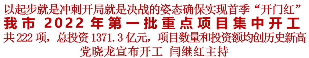 开工仪式前,党晓龙、闫继红等市领导来到展板前,听取全市第一批集中开工项目和省市重点项目情况汇报。党晓龙指出,要深入学习贯彻党的十九届六中全会、中央经济工作会议、省第十次党代会、全省经济工作会议精神,全面落实市第十二次党代会和市委十二届三次全会部署,以只争朝夕的精神和攻坚克难的干劲抓投资上项目促发展,形成大项目顶天立地、好项目铺天盖地的生动局面。要千方百计抢时间、抢机遇、抢进度,积极开拓市场,研究制定支持政策,持续优化营商环境,大力发展战新产业,鼓励以企业为主体建立创新研究院、院士工作站,引领和带动更多大项目、好项目落地,为全市经济发展注入强大动力。
