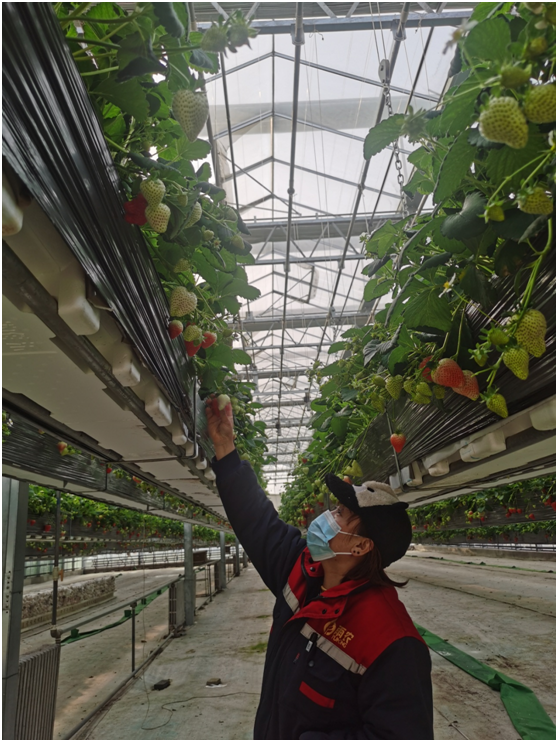 清苑区佳禾农庄现代化的温室大棚,员工在查看草莓长势情况。保定日报记者 崔旭 刘红薇 摄