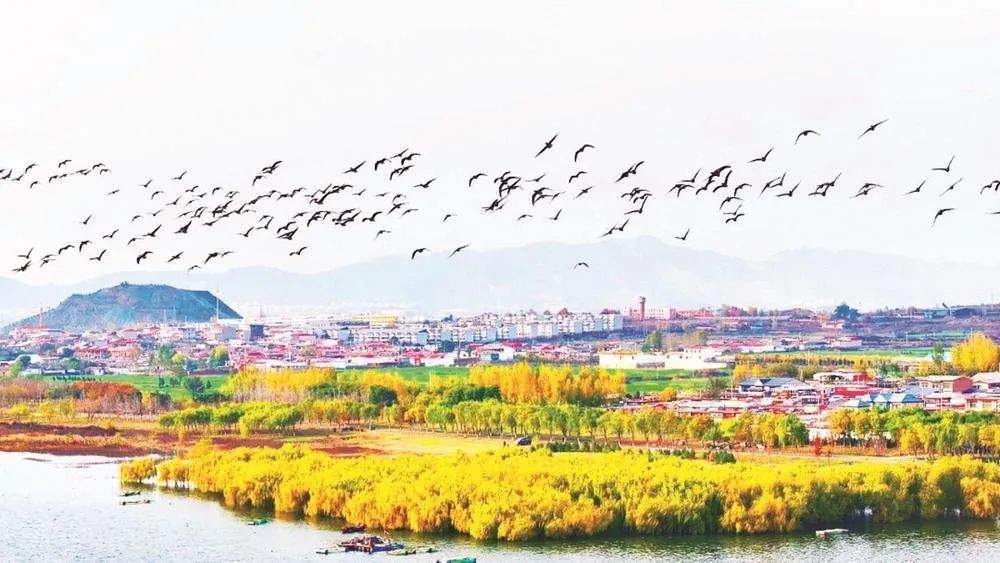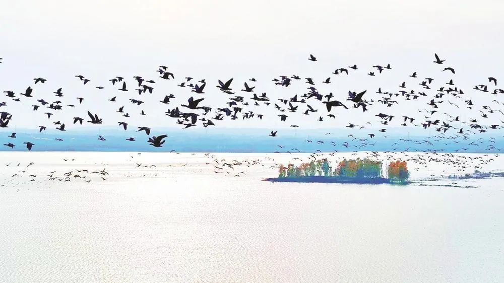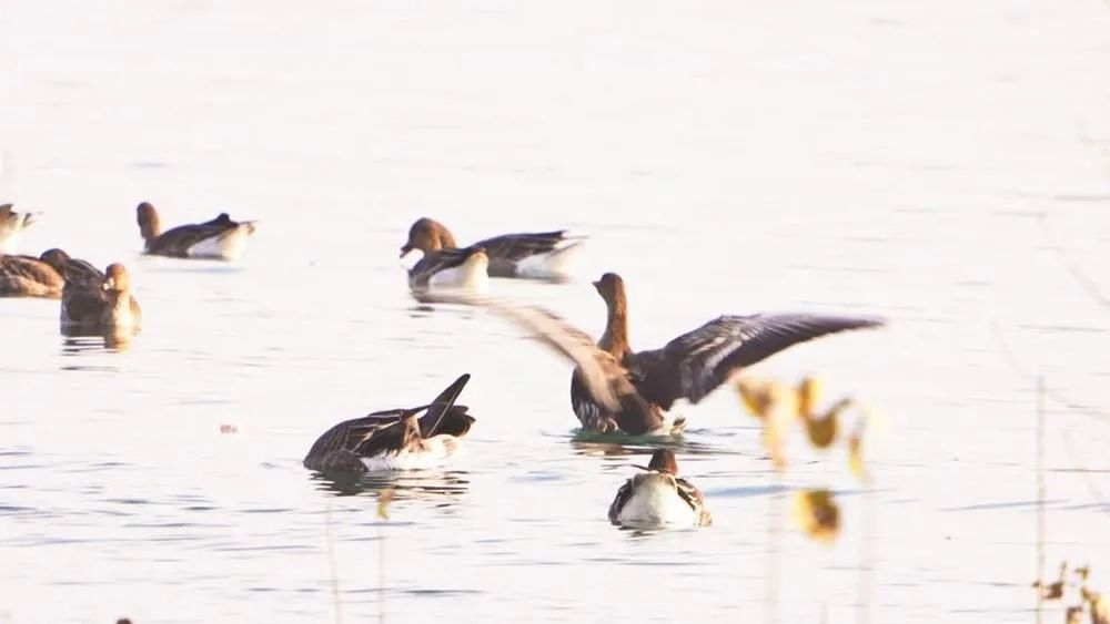 清晨薄雾中,溢泉湖烟波浩渺,宁静悠远。湖面深处,大雁、苍鹭、白骨顶、斑嘴鸭、黑鹳等灵动的候鸟时而安然卧于水面,时而觅食嬉戏,充满情趣,为这片宁静的水域增添勃勃生机。夕阳余晖下,群鸟翱翔,鸣声阵阵。它们身姿矫健而优美,或呈“一”字长蛇阵,或作“人”字造型,构成一幅“湿地雁影万羽飞”的壮美画卷。