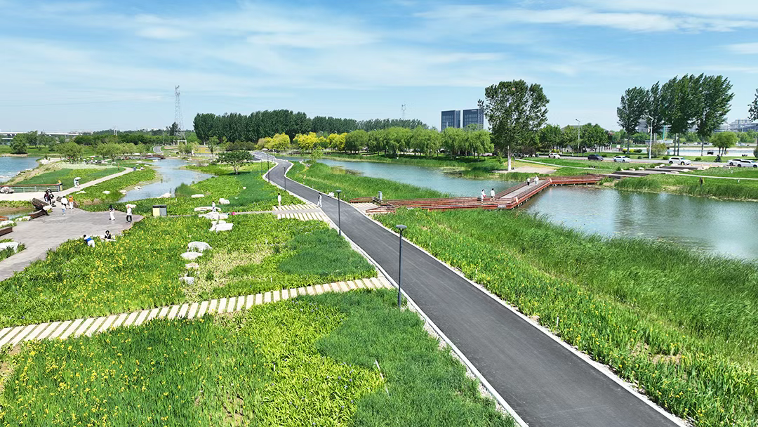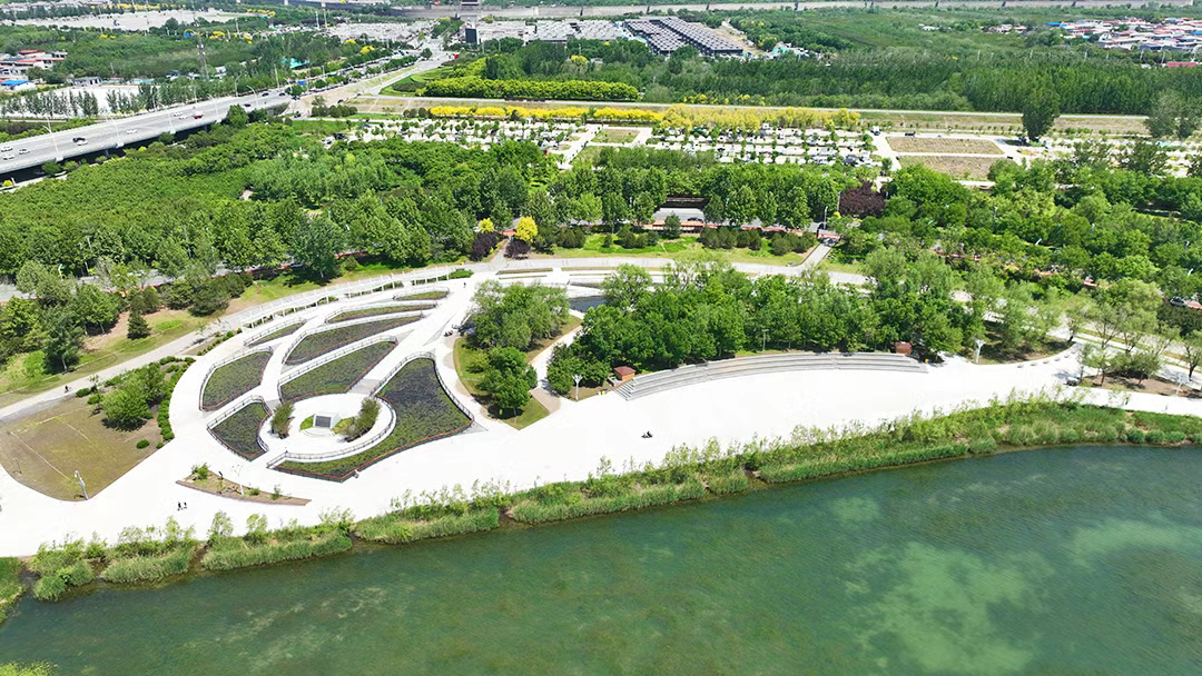 作为生态区游客热度最高的核心区域,明曦湖公园的晓月湖湿地通过提升,成了更加亲水亲绿的景观游赏区。此次提升重点梳理了晓月湖湿地周边西至土坝、东至1号潜坝的游览路线,改造了通往晓月湖湿地的2个出入口,畅通了内部园路路网,降低了追月桥上下桥的坡度,沿河增加了观景平台。对晓月湖湿地的地被进行更新,在湖内新栽植了8个品种的荷花,在湖边栽种了湿生植物黄菖蒲、鸢尾等地被花卉和狼尾草、荻等观赏草,打造“花开锦绣映彩霞、草动清风舞碧波”的美好景象。 卵石滩西邻晓月湖湿地,原为一片临河滩涂场地,北侧为林地,缺乏供游客休闲游憩的空间。此次提升充分发挥了场地的功能,因地制宜、因势利导,巧妙地将滹沱河水引入蜿蜒卵石溪流,用木栈道串联周边林地与场地,形成游览动线,使游客自然地在移步易景中把握景观空间,增强游客与自然的互动乐趣与亲水体验。同时依托林下空间,增设儿童游乐区、浅滩嬉戏区等功能分区,完善仿木座椅等生态休闲设施,构建起集休闲、娱乐、亲近自然于一体的共享开放绿地空间。