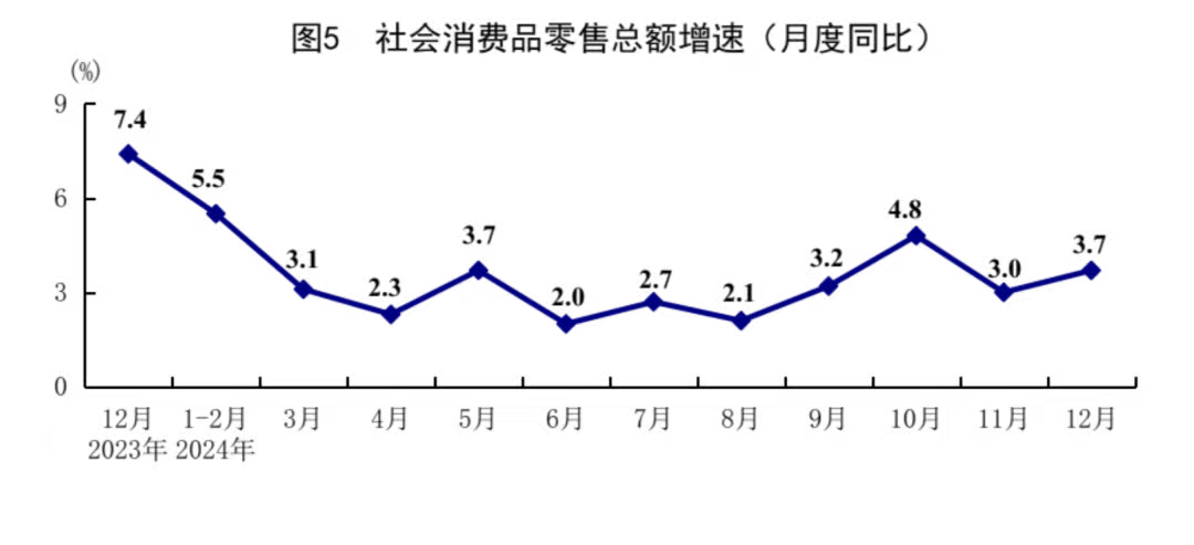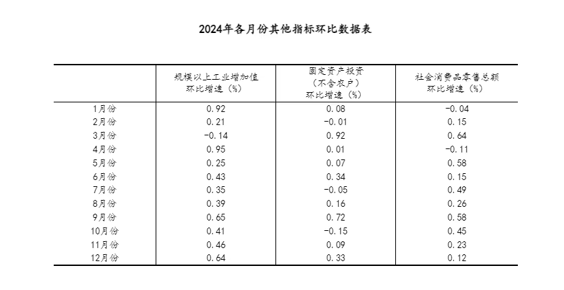 (2)根据季节调整模型自动修正结果,对近一年来各期国内生产总值、规模以上工业增加值、固定资产投资(不含农户)、社会消费品零售总额环比增速进行修订。修订结果及2024年四季度GDP环比数据、2024年12月份其他指标环比数据如下: