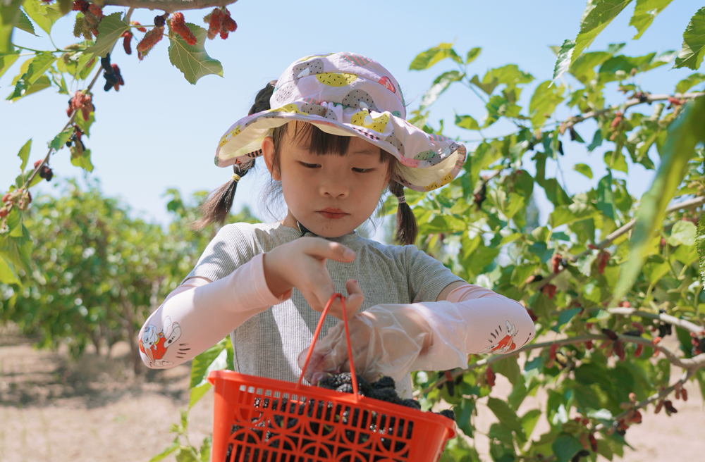 ↑小游客在桑葚园采摘桑葚。周琦 摄