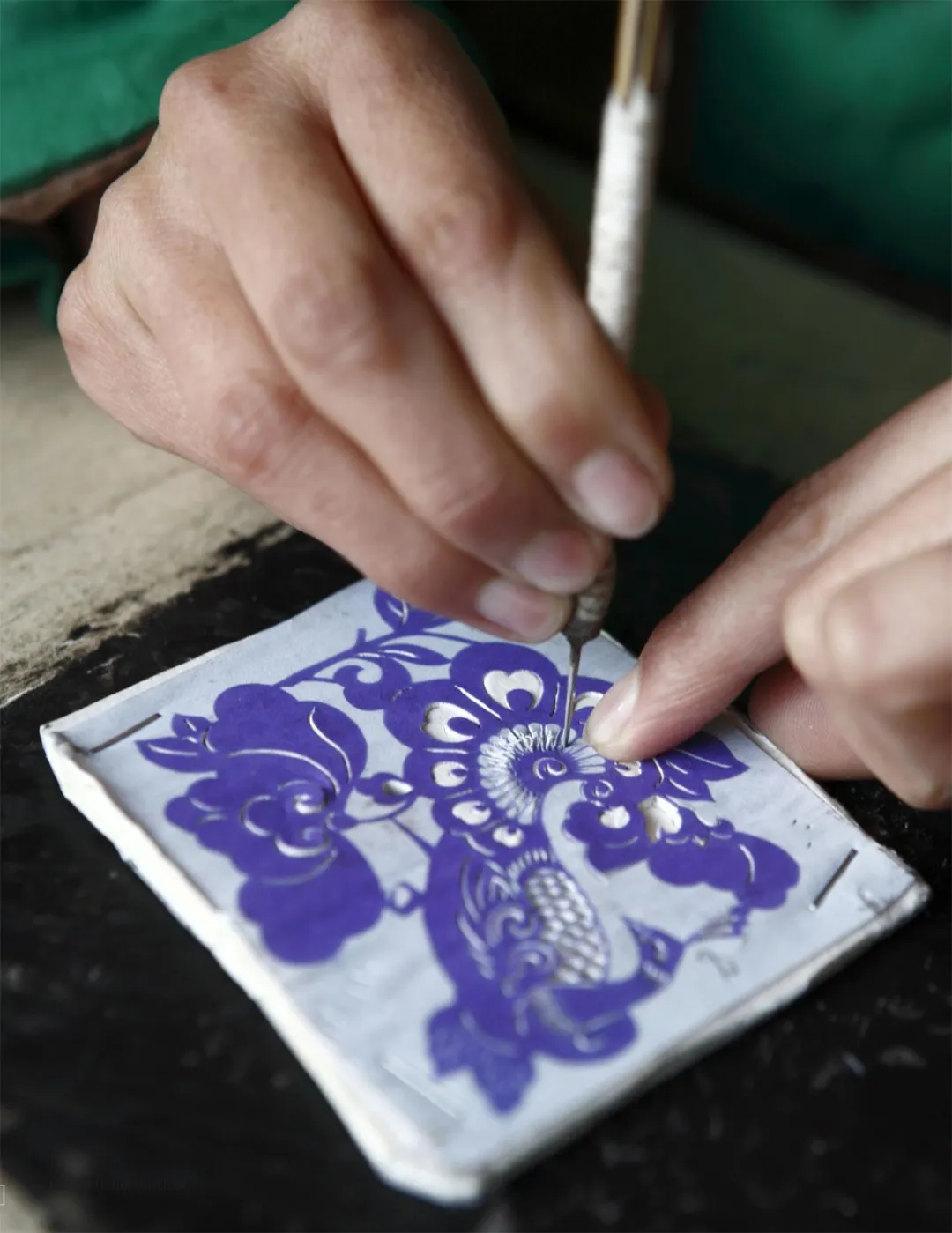 蔚县位于河北省西北部张家口市南,这座旧称“蔚州”的古城素有“京西第一州”的美称。位于蔚县西部的暖泉古镇是中国历史文化名镇,以泉水、集市、古建筑及民俗文化而闻名,这里有着全国唯一的阴刻为主、阳刻为辅、重彩点染式剪纸,在我国剪纸艺术的大家庭中堪称一枝独秀。蔚县剪纸的丰富样式也与当地的民俗文化密切相关——旧时,蔚县剪纸主要用作四时节庆与婚丧嫁娶时的窗饰,被当地人俗称为“窗花”。
