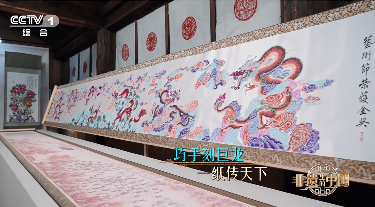 “二绝”在不用剪子而用刀刻。蔚县剪纸非遗传承人周淑英的剪纸作品《龙行天下》,长9.9米、高0.99米,花费3年时间,一共刻了200多万刀,用了20多道工序。而且每一道工序都是不可逆的,错一步整个作品就要从头再来!