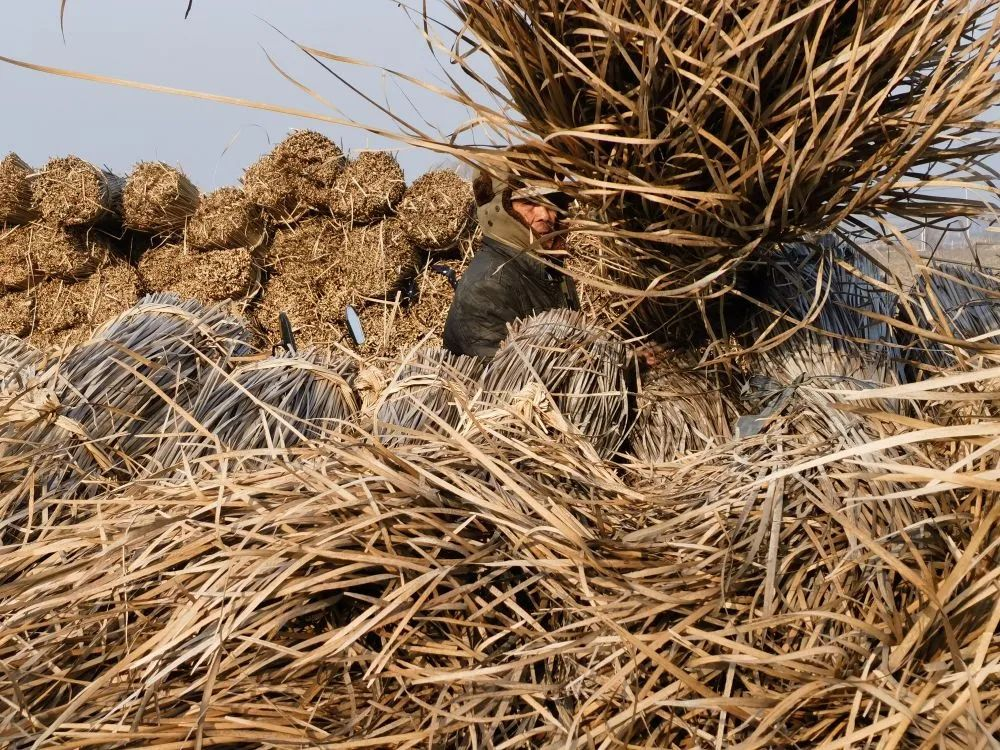 12月25日,安新县西向阳村村民在安新镇大赵庄村蒲草存放场地卸蒲草。