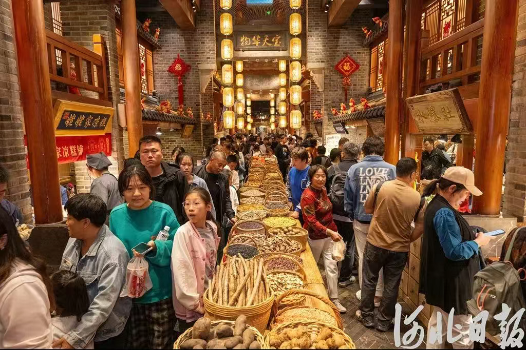 唐山宴梨园盛世戏台前,游客边品尝美食边欣赏乐亭大鼓表演。(河北日报资料片)记者王育民摄
