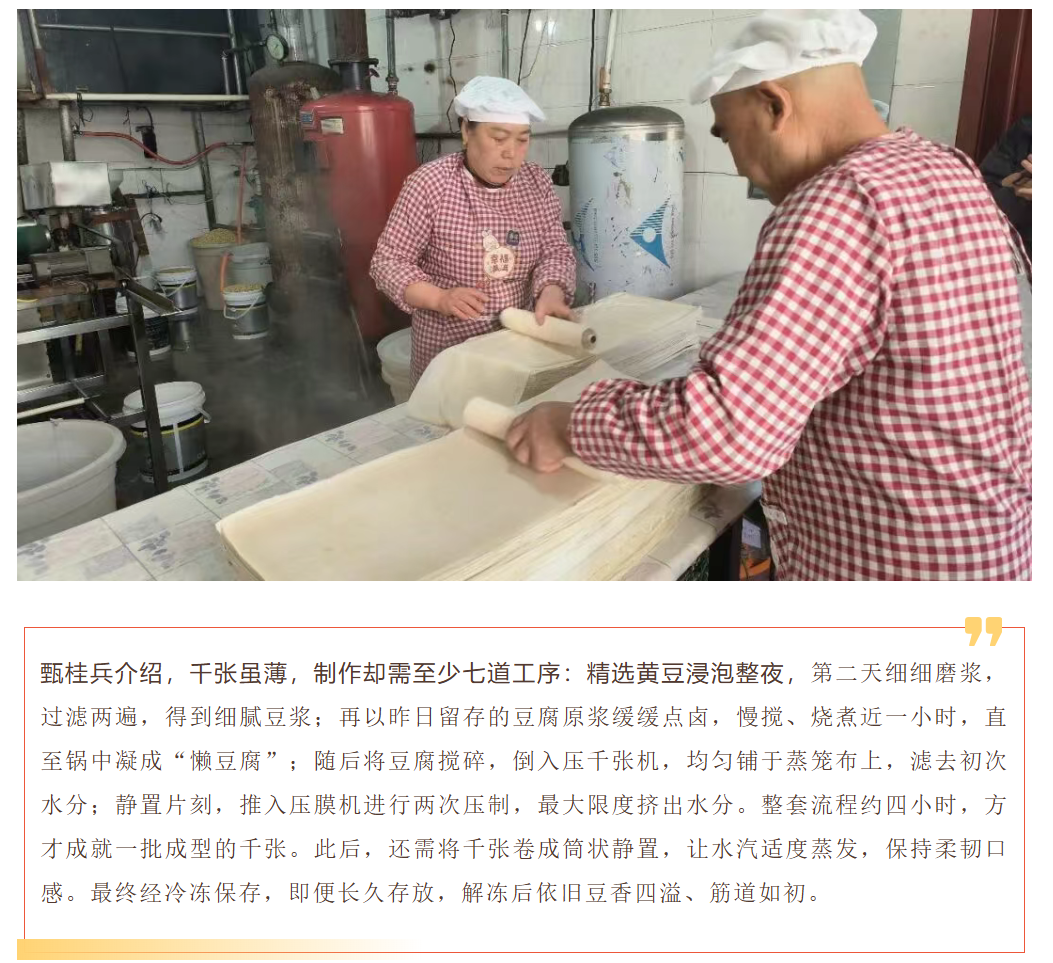 这幸福背后,是对传统手艺的敬重与坚持,正因为这份坚持,甄桂兵始终不愿简化工序,哪怕订单堆积,仍守着祖传的手感与火候。这份执拗,让每一卷千张都浸润着手艺人的温度,也让远方的食客尝到了时光深处的老味道。