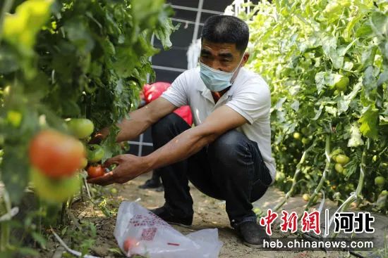 图为在固安县卡尔叔叔幸福农场温室大棚内,王世平正为顾客采摘西红柿。 吴迪 摄