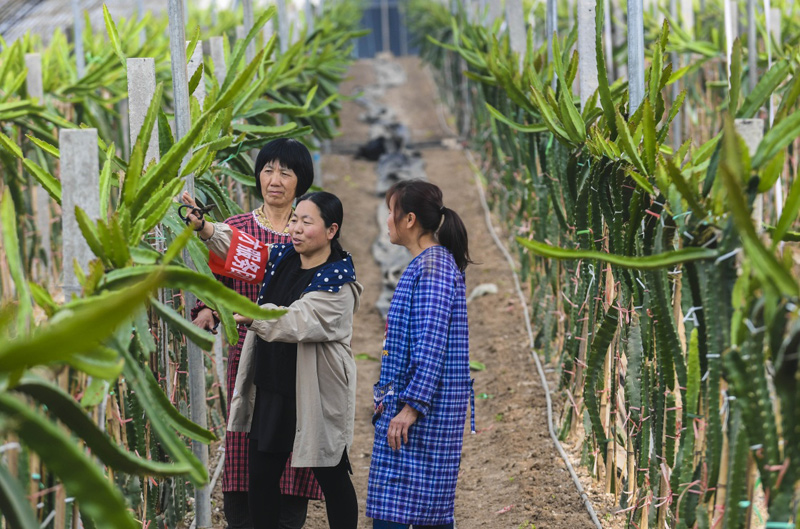 3月31日,武强县专家服务团成员在康绿健生态观光园为种植户讲解火龙果修剪技术。