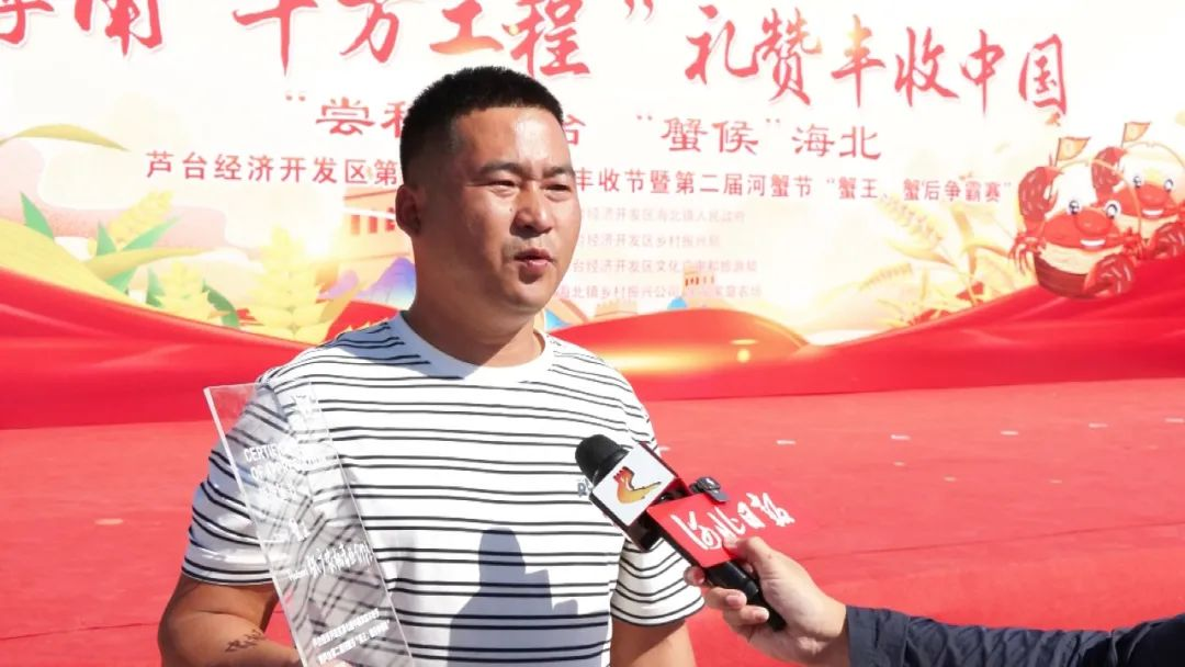 唐山芦台经济开发区张广村农机专业合作社党支部书记 刘开亮:今年稻蟹混养我们螃蟹得到了满意的大丰收,从一开始撒的五千斤,现在已经达到了一万五千斤的产量,今年的水稻比去年亩产增收了500斤。
