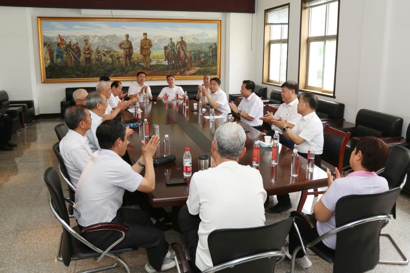 跟随纪念馆讲解员的解说,党员干部们在纪念馆展厅里系统了解了晋察冀解放区为抗日战争、解放战争胜利和新中国成立作出的卓越贡献。大家在一幅幅珍贵的照片、一件件泛黄的实物前驻足观看,深情缅怀老一辈无产阶级革命家的丰功伟绩。在纪念馆后山旧址,党员干部参观了毛泽东、周恩来等老一辈无产阶级革命家旧居,重温了那段红色历史记忆,深切感受了老一辈无产阶级革命家艰苦朴素、一心为民的革命作风。 图为党组书记、主任李志刚同志和退休老干部们座谈。