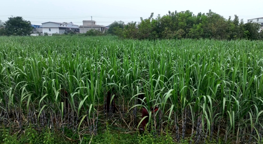 走进甘蔗林,一片片黄绿色的甘蔗便映入眼帘。甘蔗个个根茎挺拔、长势喜人,笔直地挺立在田间,空气中弥漫着淡淡的蔗香味儿。