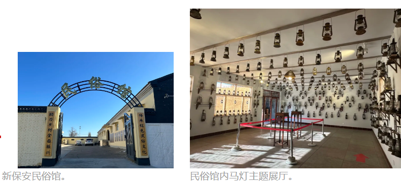 02.引入社会投资300万元,于2023年6月建成了新保安民俗馆(红色马灯主题馆),该馆紧临新保安战役纪念馆,占地2000多平米,藏品万余件,分为红色马灯文化厅、怀旧衣食住行厅等10个展厅。其中马灯展馆收藏各类马灯1367盏,着力打造全国种类最全、数量最多、规模最大的马灯主题馆。纪念馆、民俗馆每年接待参观游客1.5万人,增加集体收入10万元。