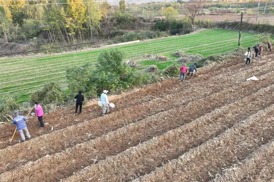 “沟间的行距是30公分,艾草根要连接着放,土要把根全部盖上,这样才能长得好……”近日,在义井镇西山村艾草种植基地,工人们正在有条不紊地开展艾草种植,切根、整地、开沟、摆放艾根、覆土填压……大家干劲儿十足。