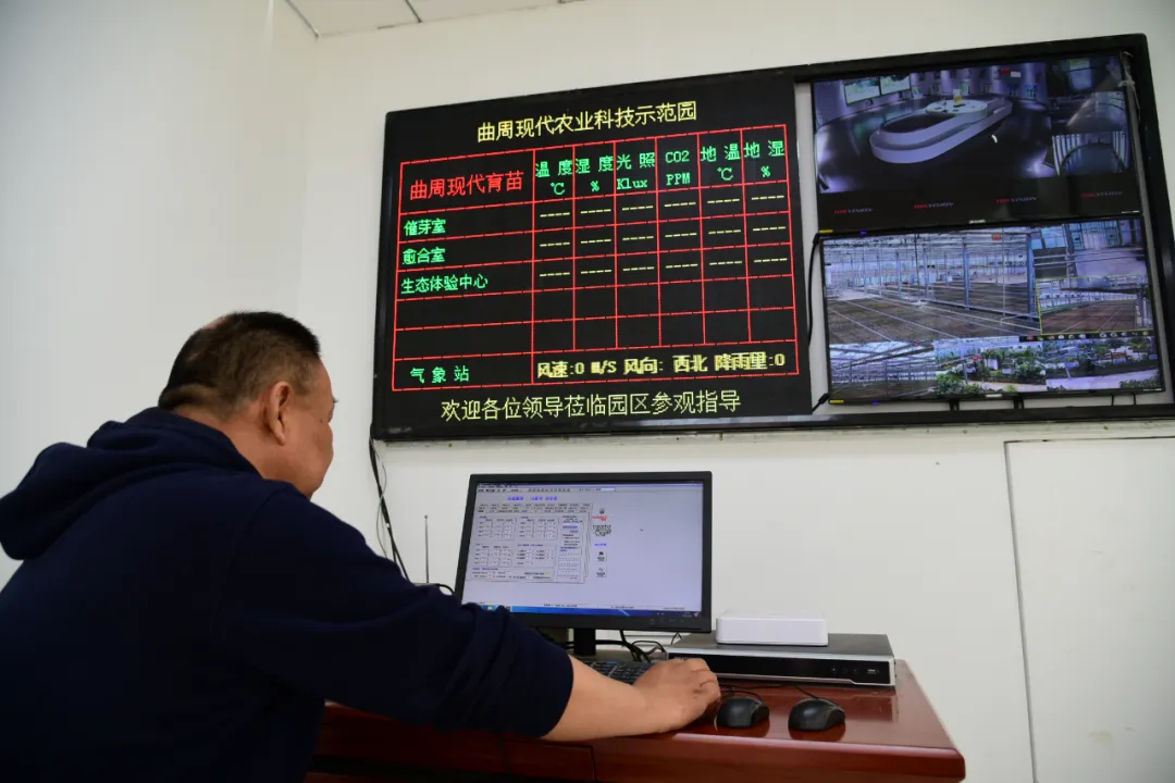 11月11日,在曲周县育苗产业园内,育苗技术人员正坐在电脑前监控着大棚内蔬菜种苗的生长情况,电脑屏幕上滚动显示着大棚内的温度、湿度、光照等数据,棚内种苗的长势情况一目了然,“云端”育苗优势凸显。