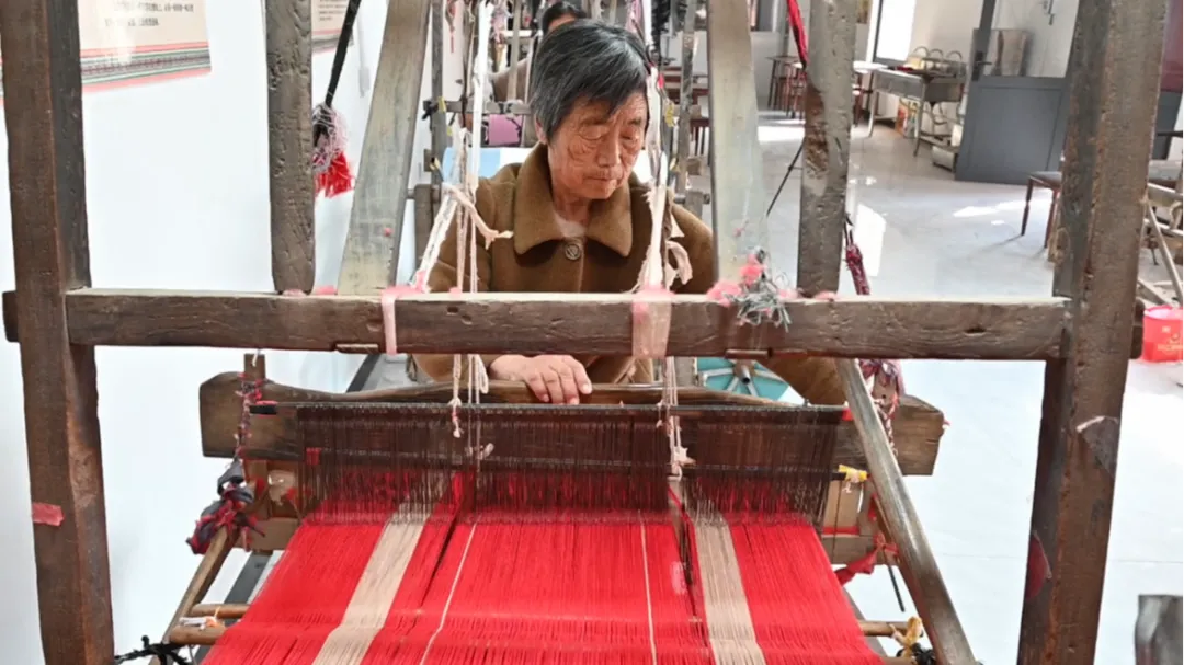 这些历经岁月的老织布机曾是村民家中的“老物件”,仅是自织自用,没有集体生产。2024年,村里将散落的10余台织机集中修复、整备,打造了一处专用于老粗布纺织的生产车间,并邀请村内“老艺人”驻点教学,通过“传帮带”培养20多名技术骨干,让古老技艺焕发活力。