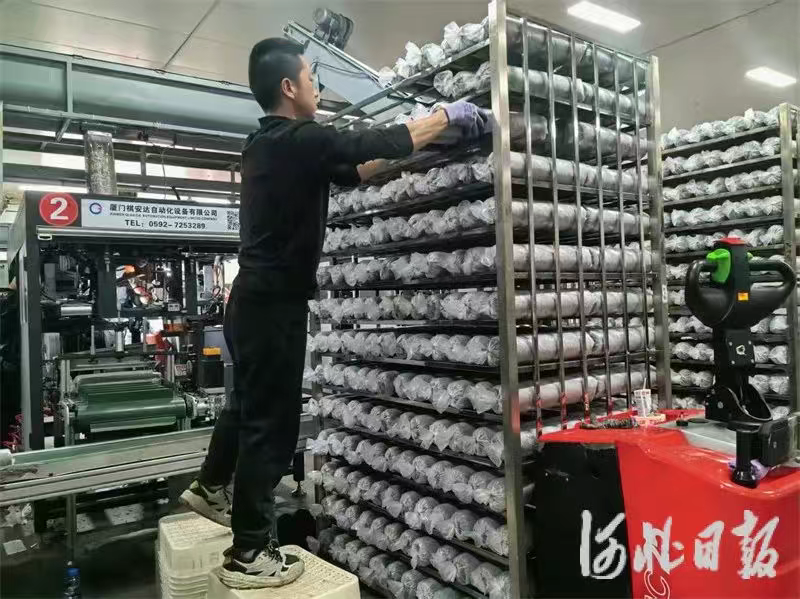 “培养车间配有自动控温控风系统,能为菌棒里的菌丝提供适宜生长环境,无论是出菇率还是优质率都有保障。”河北六青菌业有限公司常务副总经理丁佳伟介绍,公司年产菌棒1500万棒,菌棒到达菇农手中,只需7天即可出菇。