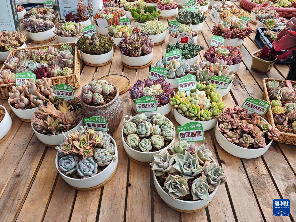 “最开始我对多肉植物并不了解,免费的种植技术指导和直播技能培训对我有很大的帮助。”秦晓刚说。图为成语主题的多肉文创产品。新华社记者 董笑坤 摄