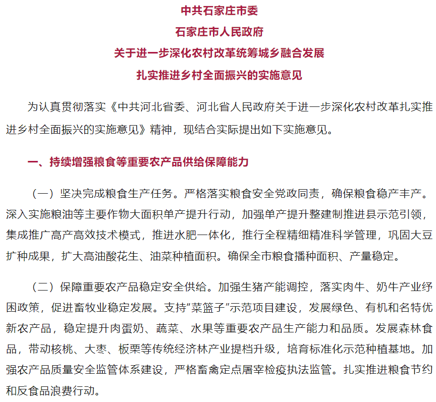 中共石家庄市委 石家庄市人民政府关于进一步深化农村改革统筹城乡融合发展扎实推进乡村全面振兴的实施意见