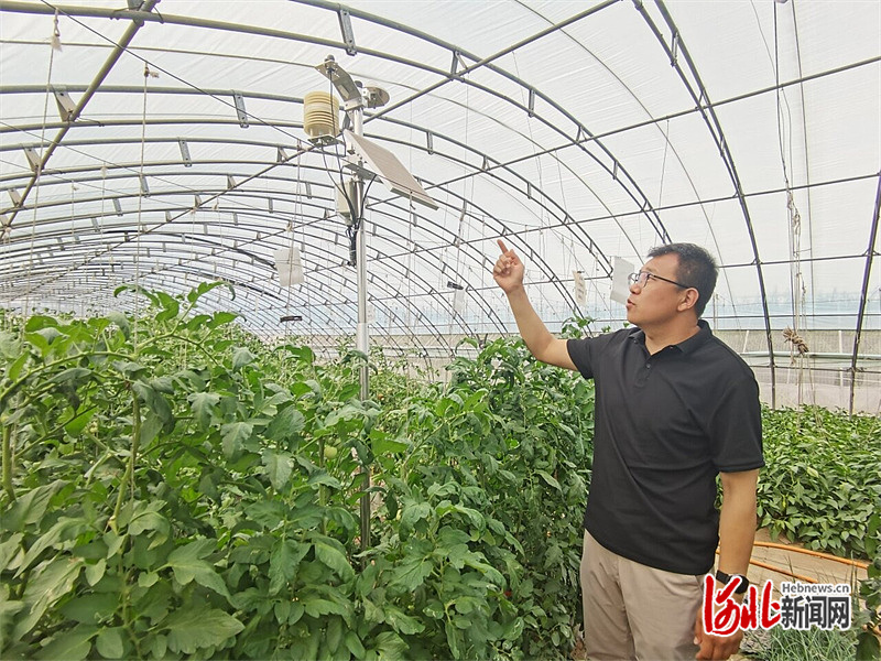 6月23日,在位于石家庄市鹿泉区大河村的省农科院大河实验站,省农林科学院农业资源环境研究所副研究员史建硕介绍棚内的光照强度测量仪。河北日报记者 李冬云摄