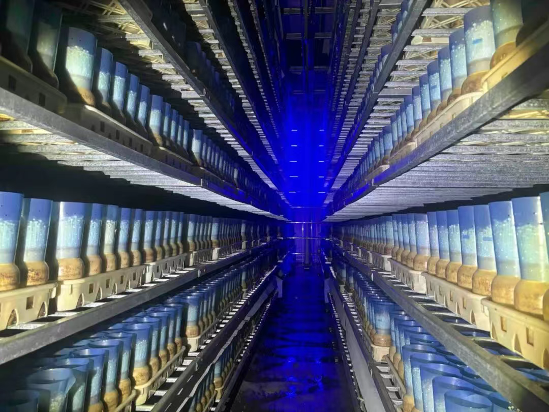 走进生育室,一股带着寒意的空气扑面而来。眼前景象蔚为壮观——10层高的立体栽培架直通屋顶,一瓶瓶金针菇整齐排列沐浴蓝光,洁白菇体挺拔生长。