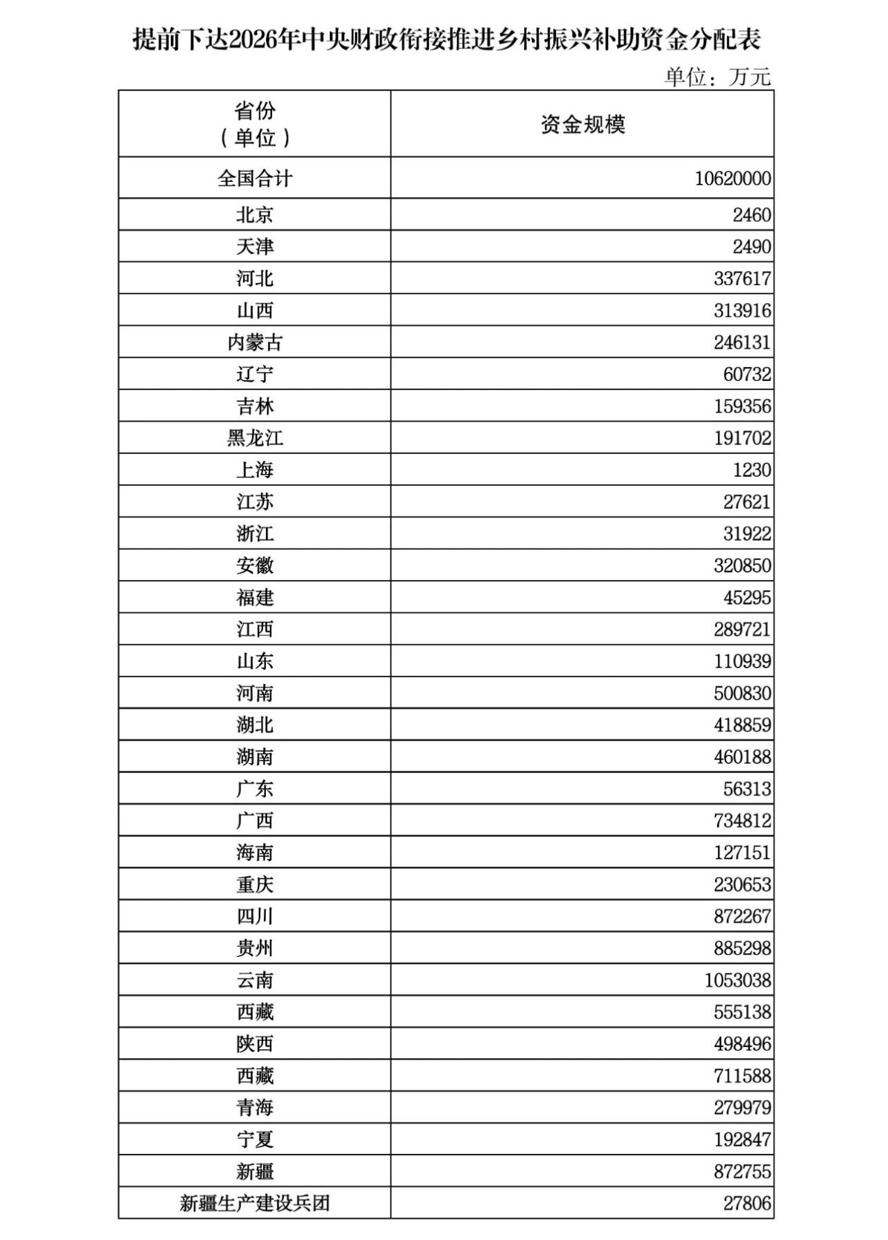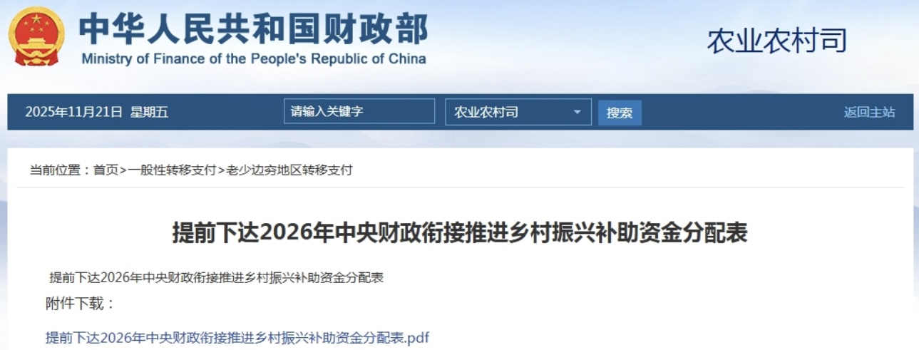 财政部提前下达2026年乡村振兴补助资金1062亿元