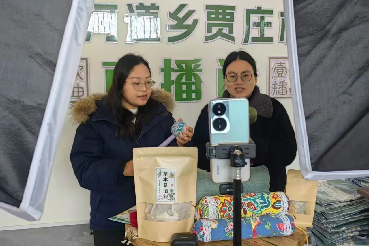 近日,在曲周县大河道乡前河道村直播间,艾草锤、健康甩打袋、艾草泡脚包整齐陈列,前河道村村务工作者王冉和东老营村村务工作者景文娟褪去正装,化身“带货主播”,用带着乡音的普通话,既讲产品功效,又叙乡土情怀,亲切推介大河道乡特色“养生三宝”。