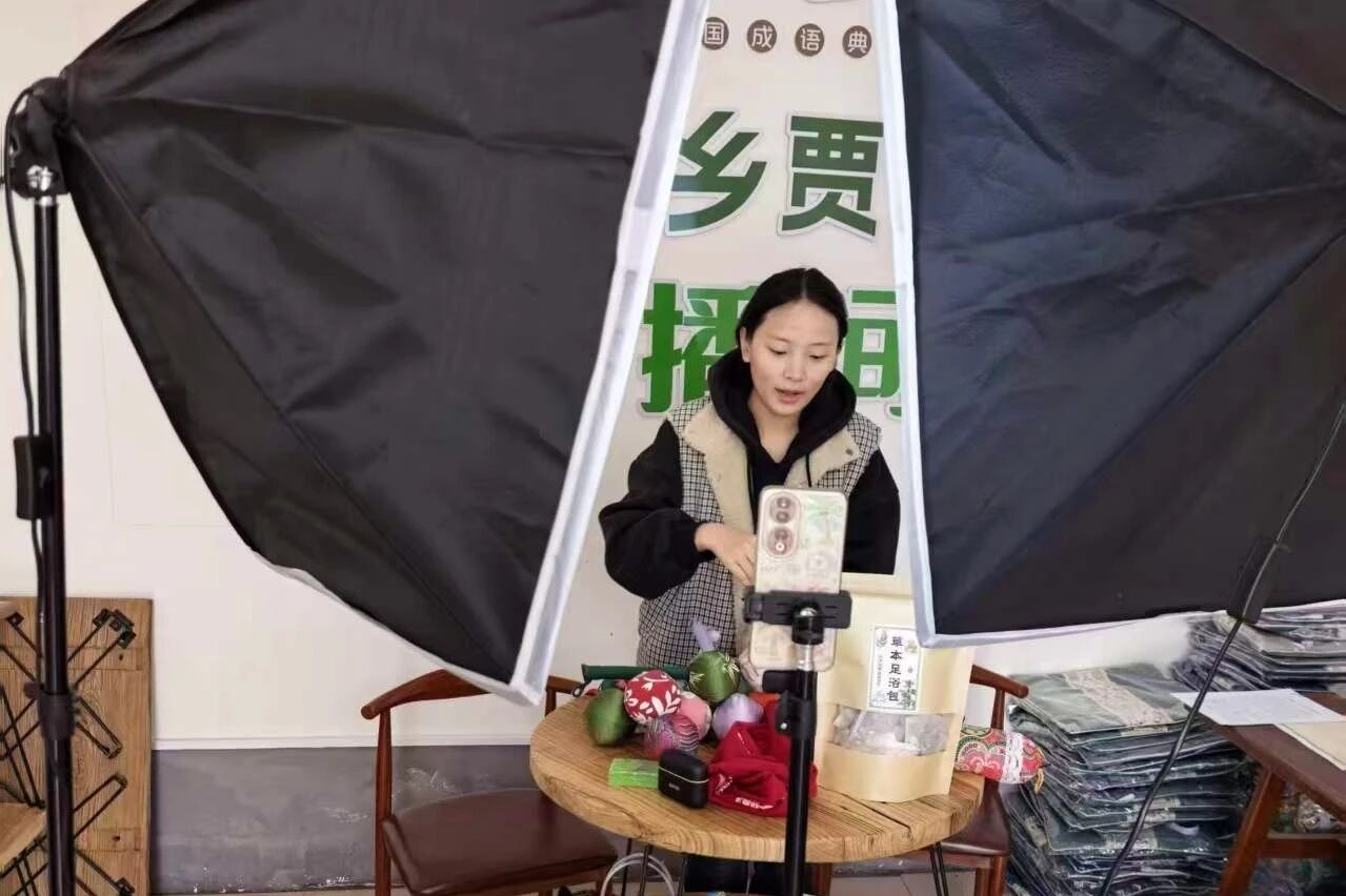 在大河道乡贾庄村直播现场,贾庄村干部贾梦鑫现场演示:艾草锤轻敲肩颈;健康甩打袋轻挥腰背;艾草泡脚包融入温热水中,淡淡艾香萦绕。她用朴实生动的语言、鲜活真实的场景展示,将家乡好物搬上“云端”,充分展现了基层干部敢闯敢试、积极向上的精神风貌。