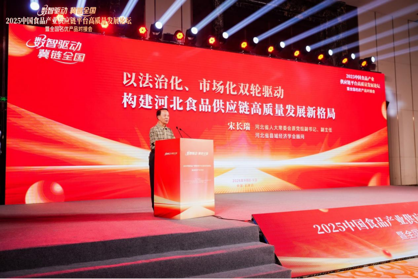2025年9月8日,2025中国食品产业供应链平台高质量发展论坛暨全国名优产品对接会在河北石家庄圆满召开。本次活动特别邀请了河北省人大常委会原党组副书记、副主任、河北省县域经济学会顾问宋长瑞,河北省国有资产控股运营有限公司党委书记、董事长陈君朝,河北经贸大学党委常委、副校长、河北省县域经济学会会长杨金田等领导莅临现场并致辞;中国食品工业协会、河北省网络社会组织联合会、河北国控商贸集团有限公司、河北省供销数字信息有限公司、河北交投电子商务有限公司、黑龙江省交投国际物贸集团有限公司相关领导,麦得邻、Bolin新零售、唐山汇旺行、北京没想到、千喜鹤、同福爆品仓、重庆乐尔乐、西安每一天便利连锁、知花知果、有井有田、小许到家、阿上阿上等供应链企业及来自各地的食品企业、经销商500余人参会。