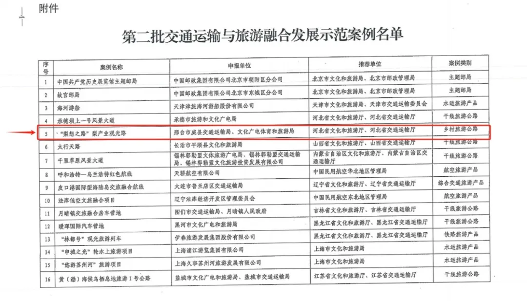 为深入推进实施《交通强国建设纲要》《“十四五”旅游业发展规划》,更好促进交通运输与旅游融合发展,近日,根据《文化和旅游部办公厅、交通运输部办公厅、国家铁路局综合司、中国民用航空局综合司、国家邮政局办公室、国铁集团办公厅关于开展第二批交通运输与旅游融合发展示范案例的通知》(办资源发〔2024〕111号),文化和旅游部、交通运输部、国家铁路局、中国民用航空局、国家邮政局、国铁集团共同遴选出第二批交通运输与旅游融合发展示范案例68个,我市威县“梨想之路”入选示范案例。
