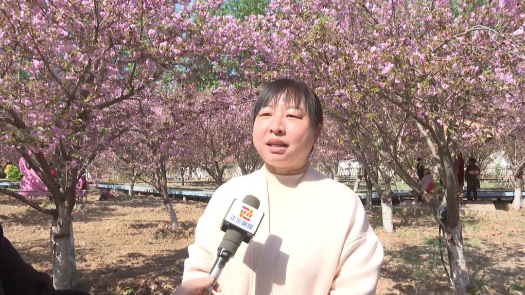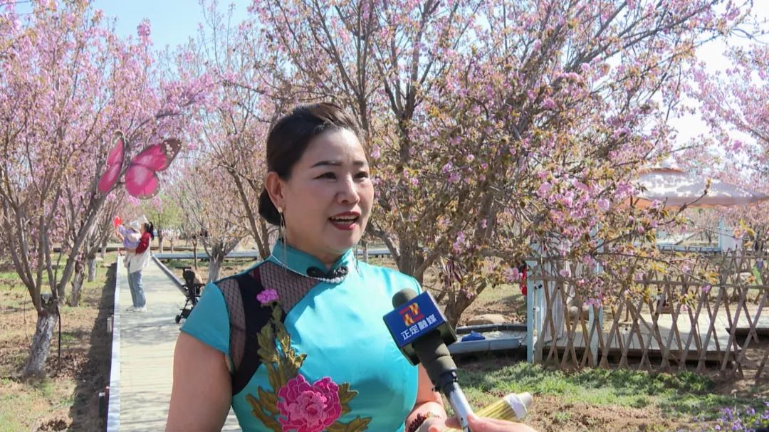 游客:这里的樱花开了,非常漂亮,我们穿着蓝色的旗袍来这里打卡留念,很出片。