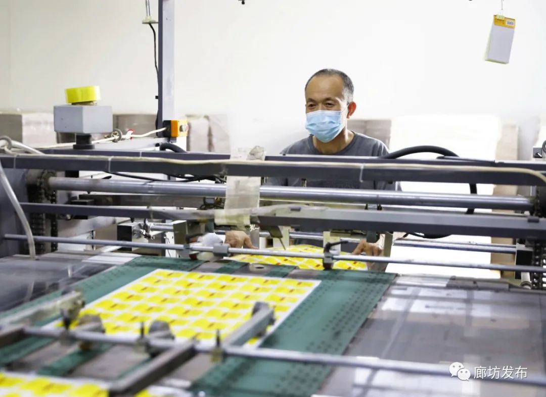 图为在固安县工业园一印刷公司生产车间,工作人员对印刷品进行不干胶模切。 吴迪 摄